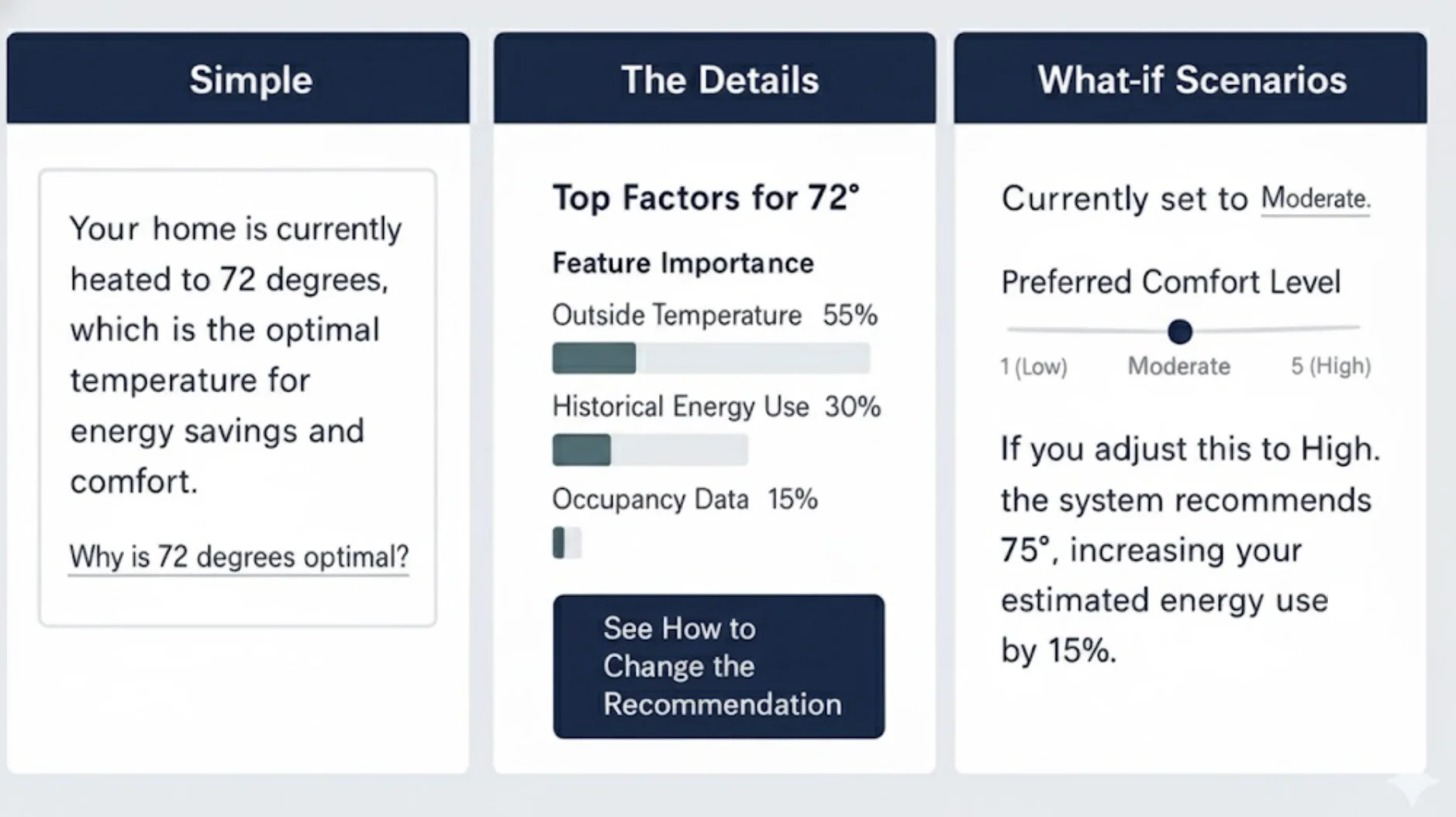 This layered approach respects user attention and expertise, providing just the right amount of information for their needs. Let’s imagine you’re using a smart home device that recommends optimal heating based on various factors.