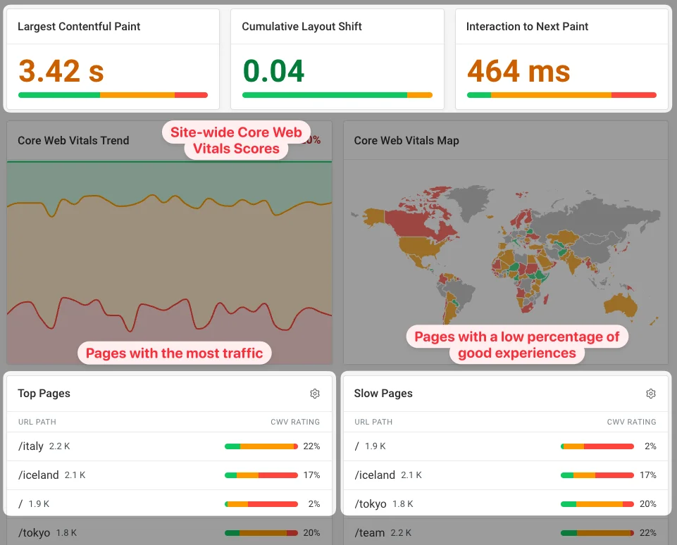 Real user data is the best place to check for slow pages. It tells you whether the technical issues on your site actually result in poor user experience. It’s easy to collect across your whole website (while synthetic tests need to be set up for each URL). And, you can often get a view count along with the performance metrics. A moderately slow page that gets two visitors a month isn’t as important as a moderately fast page that gets thousands of visits a day.