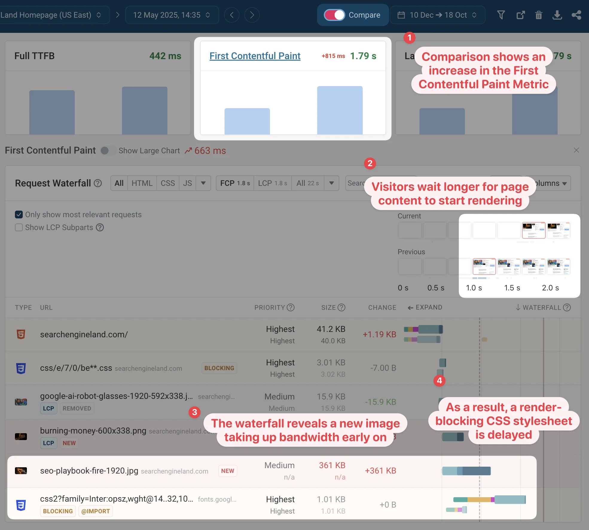 From the report, it’s clear that a CSS file that previously took 255 milliseconds to load now takes 915 milliseconds. Since stylesheets are required to render page content, this means the page now loads more slowly, giving you better insight into what needs optimization.