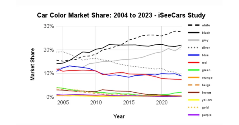 Last year, a study found that cars are steadily getting less colourful. In the US, around 80% of cars are now black, white, gray, or silver, up from 60% in 2004. This trend has been attributed to cost savings and consumer preferences. Whatever the reasons, the result is hard to deny: a big part of daily life isn’t as colourful as it used to be.